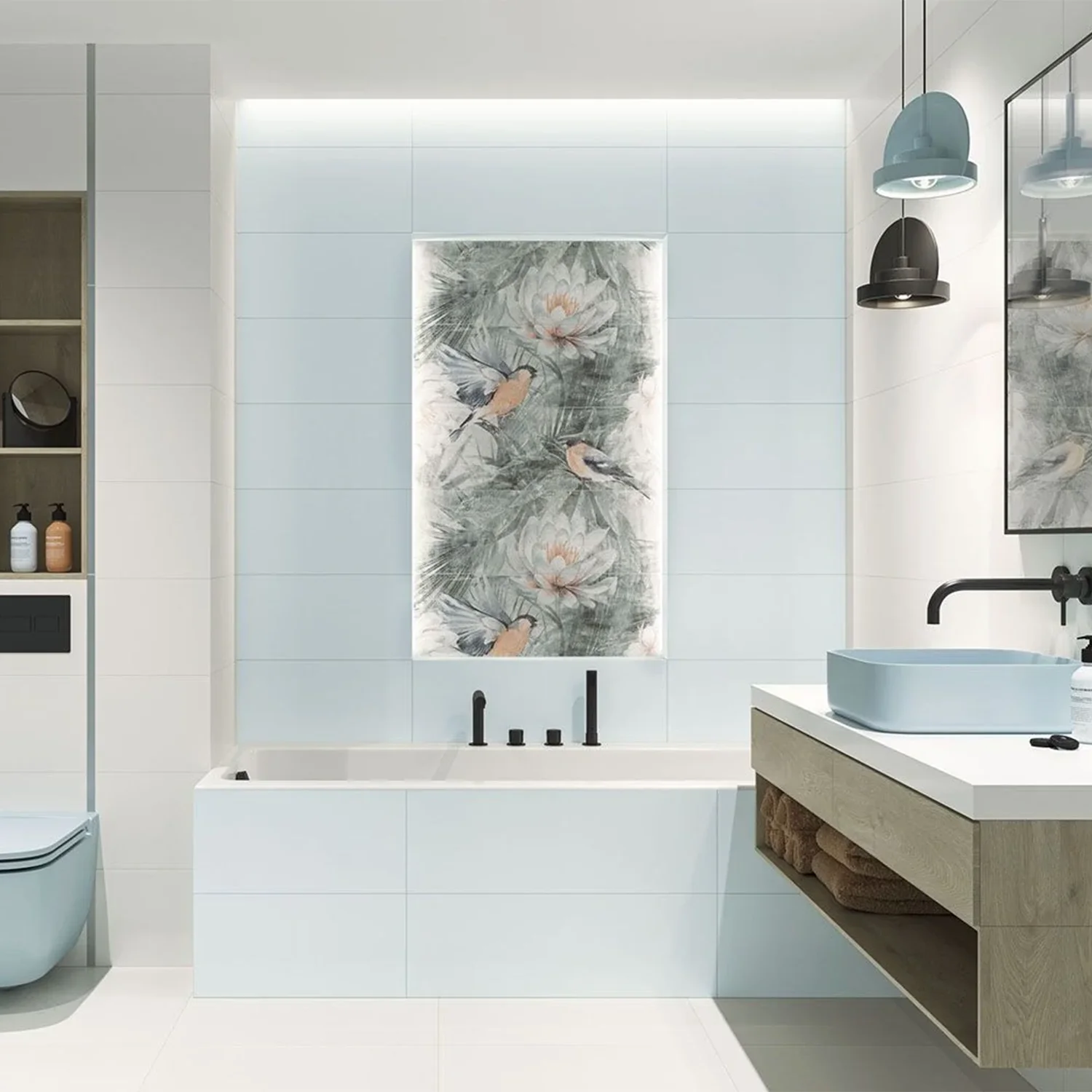 - Gaišas flīzes padara vannasistabas gaišas un plašas.