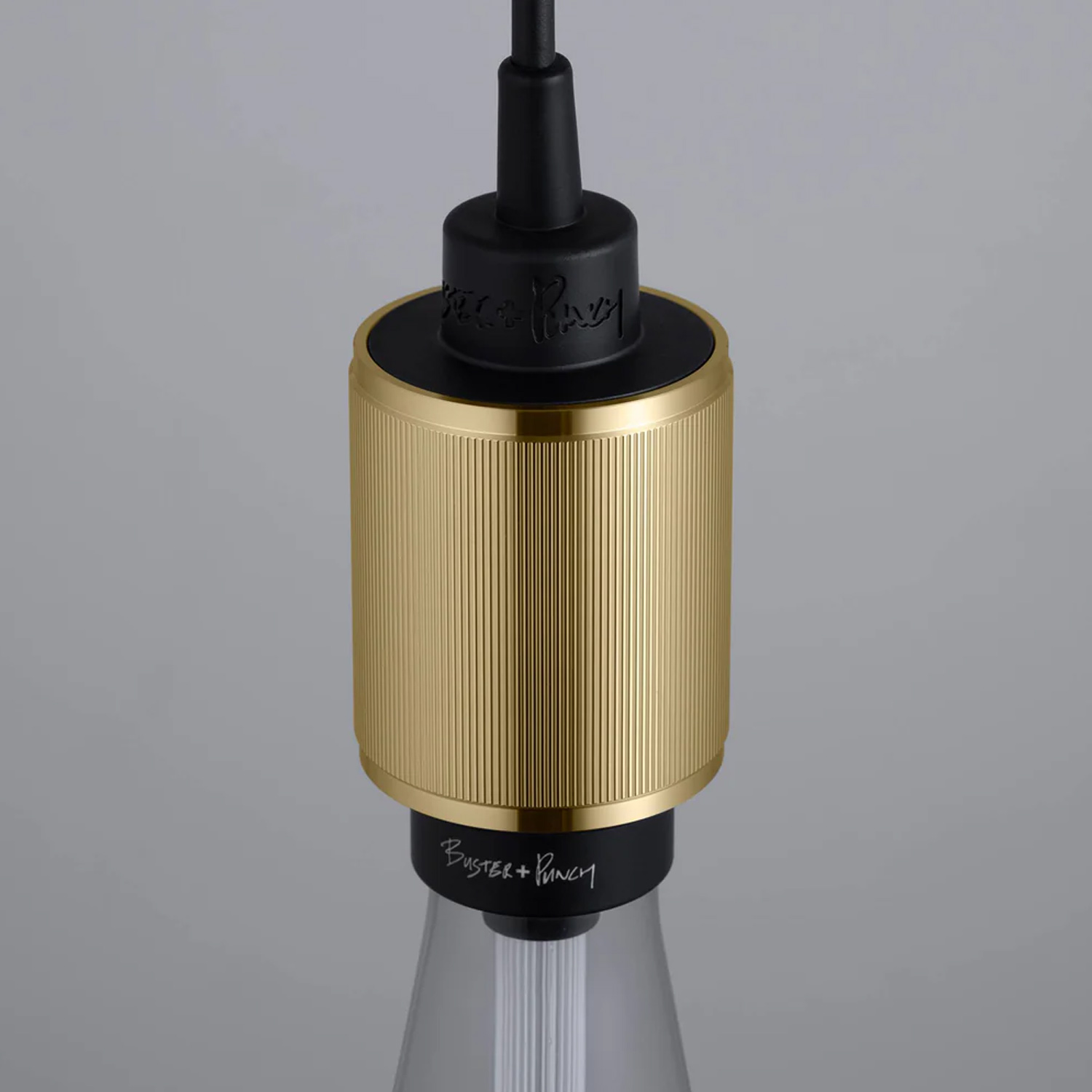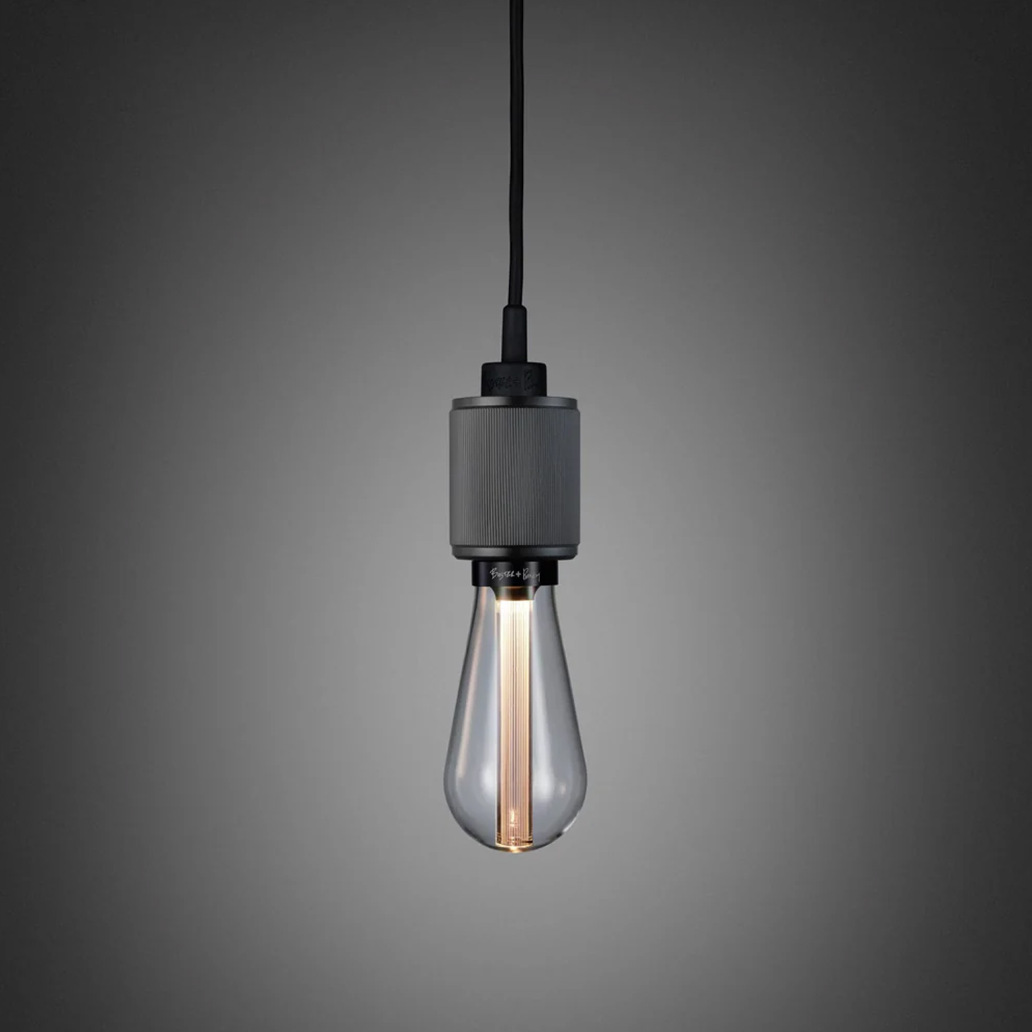 Piekaramā lampa, izgatavota no masīva metāla, ar mūsu raksturīgo lineāro rombveida rievoto (diamond-cut knurl) rakstu. Lampa ir aprīkota ar matēti melnu gumijas vadu un matēti melnu metāla griestu stiprinājumu. Paredzēta lietošanai ar E27 spuldzēm — vislabāk izskatās ar B+P Buster Bulbs spuldzēm, kas tiek pārdotas atsevišķi.