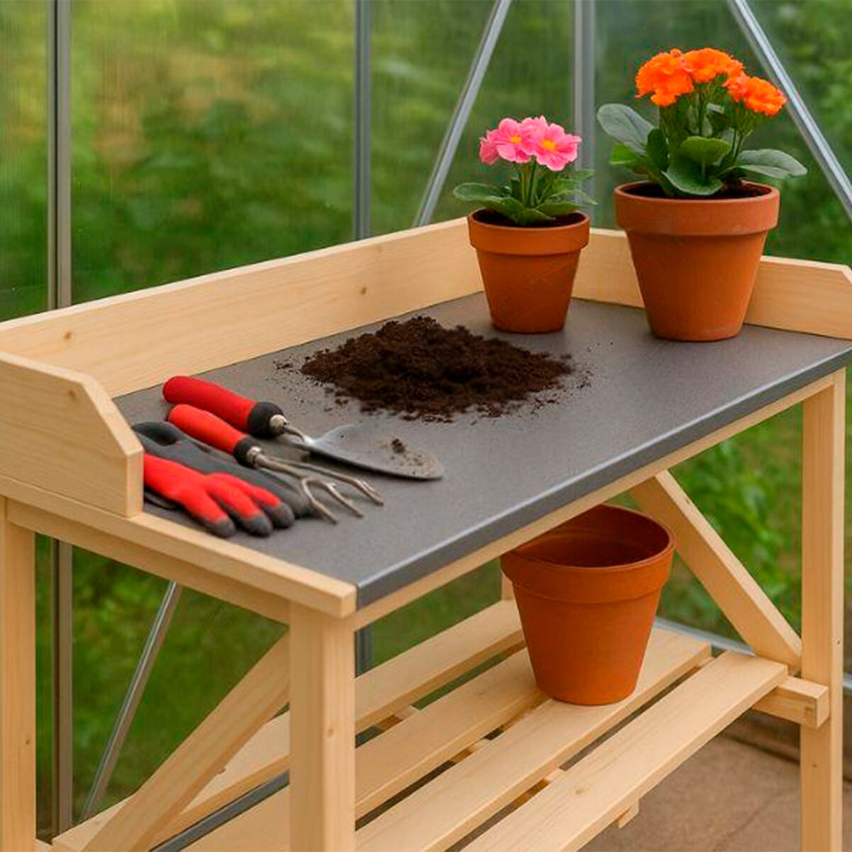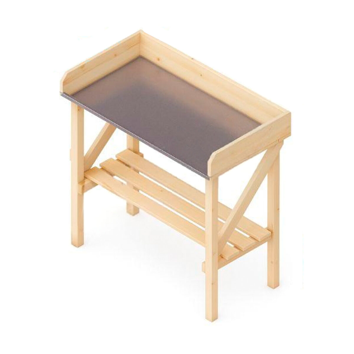 Ir patīkami darboties sakārtotā un parocīgi aprīkotā vidē. Lūk, dārznieka darba galds no egles koka ar izturīgu metāla virsmu un apakšējā daļā izvietotu plauktu. Ideāli piemērots tam, lai nodarbotos ar pārstādīšanas, piķēšanas darbiem, lai sašķirotu jauno ražu, lai sagatavotu piederumus nākamajai sezonai. Zem galda ērts plauktiņš dažādu dārza lietu novietošanai.