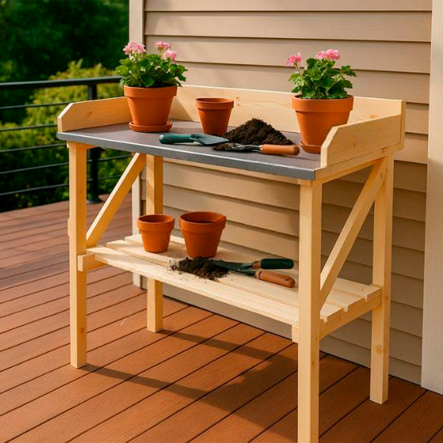 Ērts galdiņš ar skārda darba virsmu, mazo dārza darbu veikšanai – puķu pārstādīšanai, garšaugu piķēšanai.